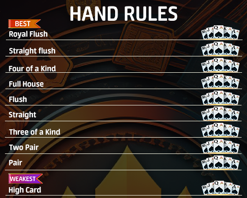 In Texas Hold'em, players aim to make the best five-card hand using any combination of their two hole cards and the five community cards. Here are the hands in Texas Hold'em from highest to lowest: